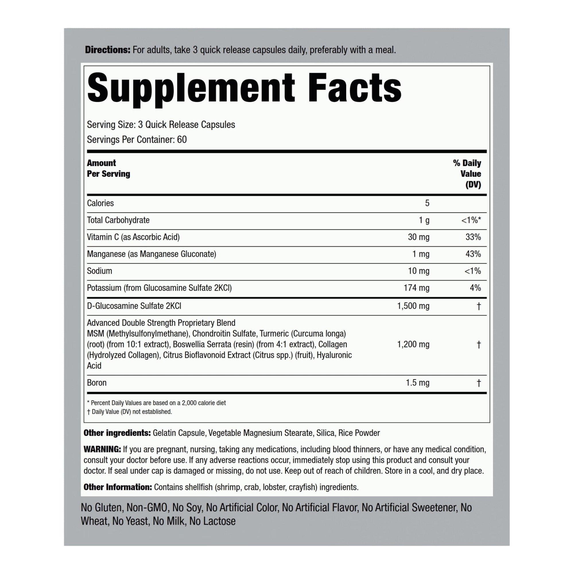 Piping Rock's Advanced Triple Strength Glucosamine Chondroitin MSM Plus Turmeric features a potent 1,500 mg supply per serving of glucosamine sulfate, along with chondroitin and MSM in optimal coated caplets. In addition, it is enhanced with collagen, turmeric, boswellia serrata, and more from a powerful triple-strength proprietary blend. Our gluten-free and non-GMO formula contains no preservatives.