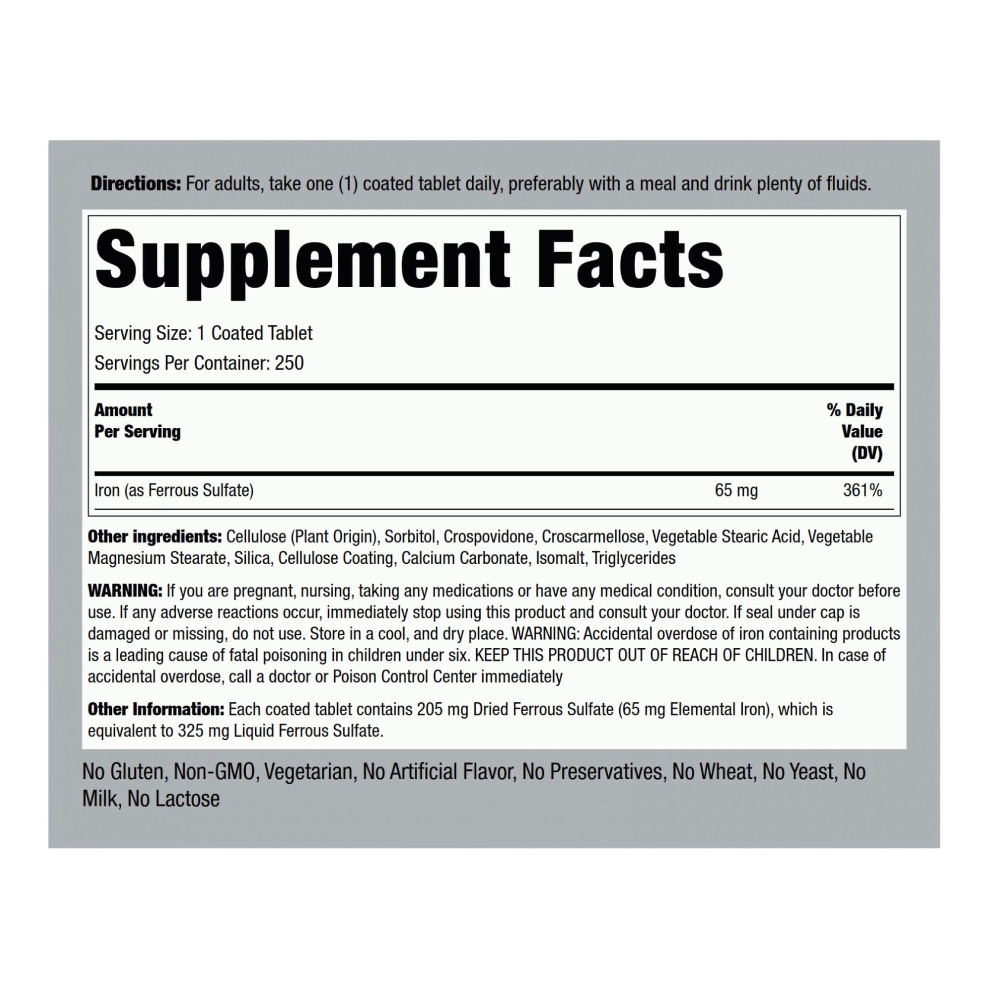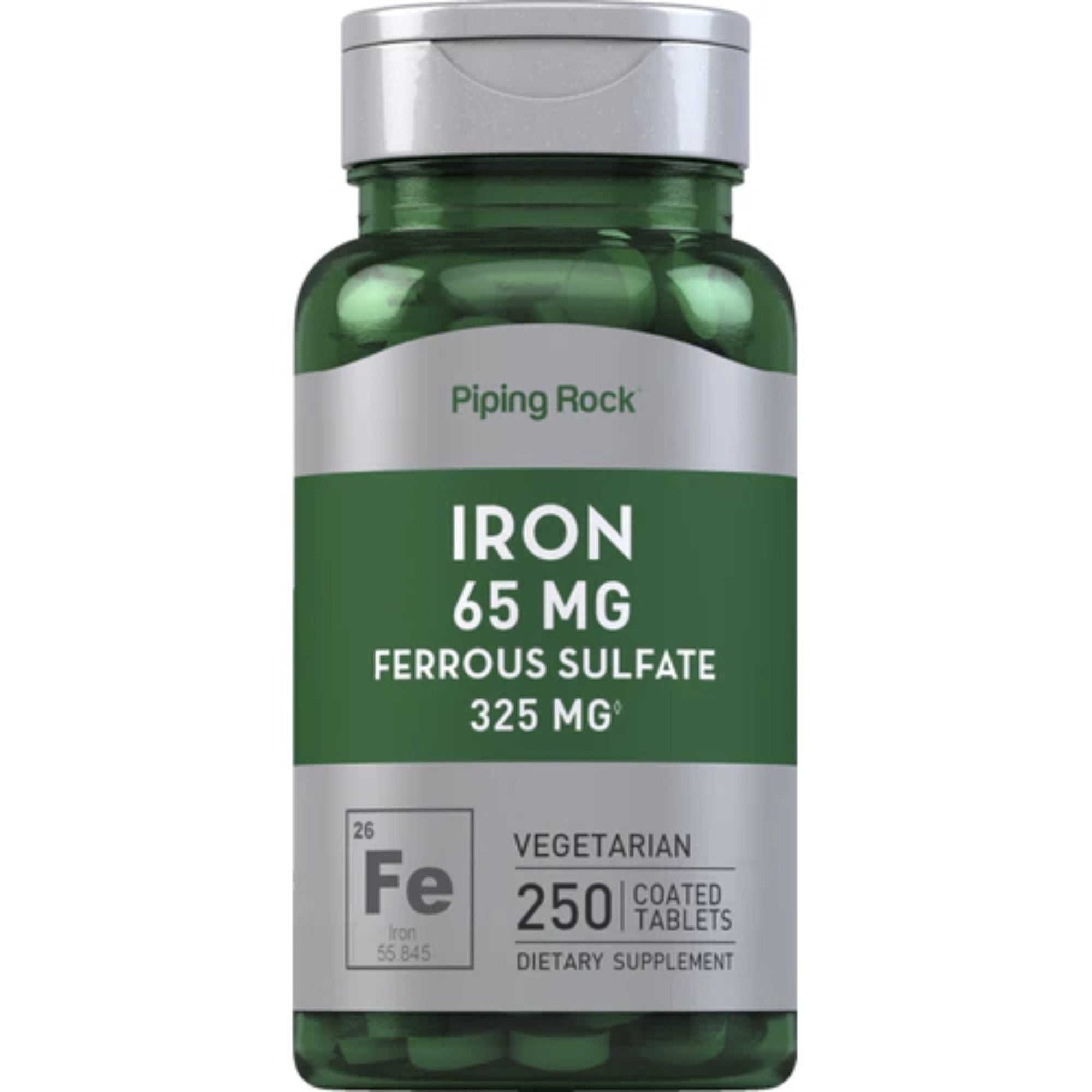 Piping Rock Iron 65mg (Ferrous Sulfate 325mg) is a high-quality dietary supplement designed to support those with iron deficiency and help maintain healthy iron levels. Iron is a vital mineral that plays a crucial role in the formation of red blood cells, aiding in oxygen transportation throughout the body. This supplement provides elemental iron in the form of ferrous sulfate, which is highly bioavailable, ensuring better absorption by the body.