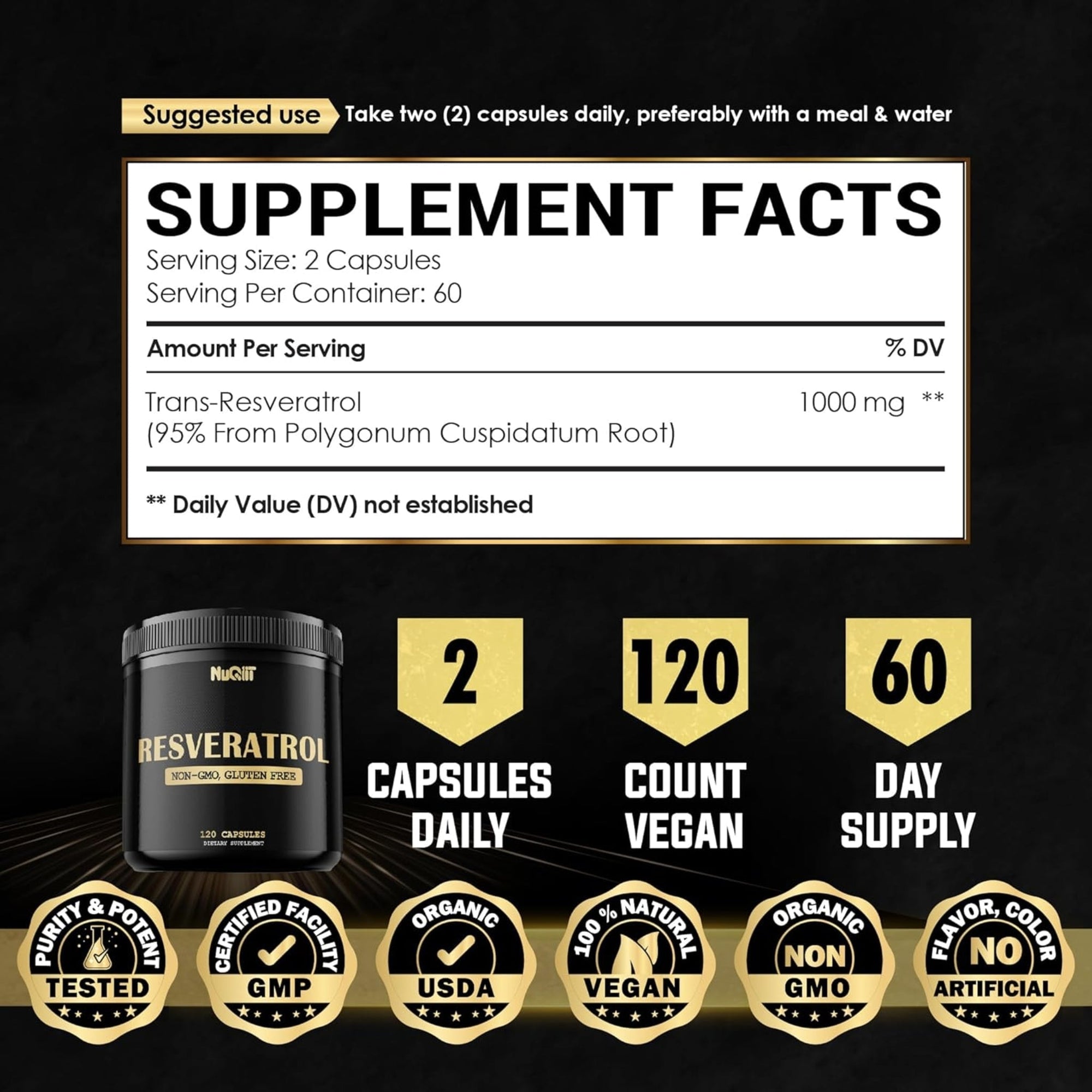Nuqitt Resveratrol 1000mg is a potent, high-strength botanical extract supplement designed to support various aspects of health and wellness for both men and women. Containing 120 capsules per bottle, it is non-GMO, gluten-free, organic, and vegan, making it suitable for a wide range of dietary preferences. This supplement is specifically formulated for enhanced absorption, ensuring that your body gets the maximum benefit from each dose.