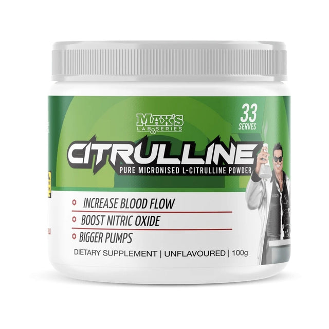 Max’s Lab Series Citrulline delivers 100% pure, micronised L-Citrulline—an amino acid essential for enhancing blood flow, muscle pumps, and overall performance. Each serve provides 3g of clean, unflavoured L-Citrulline to fuel your workouts and optimise nitric oxide levels naturally.