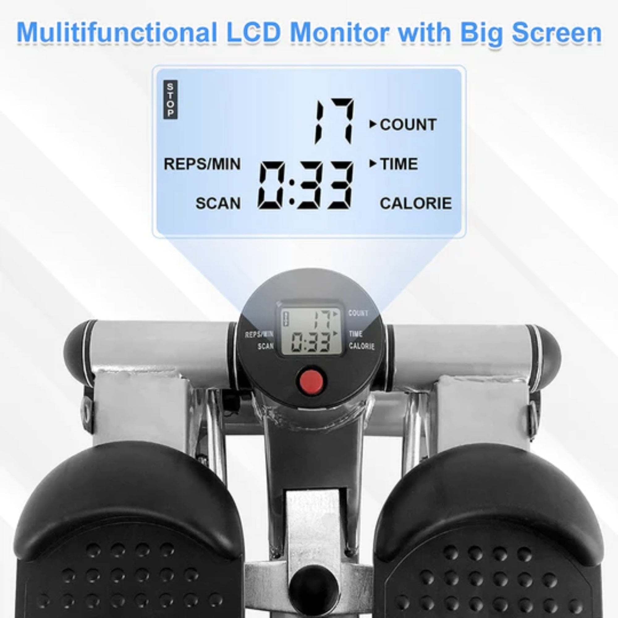 Move up and down with side-to-side action on the Sunny Health & Fitness Twister Stepper. Our Twister Stepper has an adjustment knob to switch up the step motion height, working your deep muscles without putting extreme pressure on bones and joints. The twist action on this Stepper also helps to tone the glutes and thighs while the attached resistant bands will help work your upper body. Our LCD display console will help you keep track of Time, Calories, Rep Count, and Total Count.